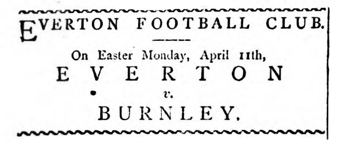 The latter paid their return visit to the Anfield enclosure yesterday and as a large amount of interest was taken in the eventfully 6,000 persons were present. Roach started the ball on behalf of Everton, who immediately initiated an attack, after Sugg had kicked away, Everton had a couple of corner kicks, both of which, however, proved fruitless. Dobson levelled a shot at the Burnley citadel, and had hard lines in not scoring as the ball struck the crossbar, and rebounded into play. Abraham cleared the danger, and then Burnley chiefly by a fine passing run on the part of the forwards' got into the Everton quarters, when Joliffe left the goal, and Burnley would certainly have scored but for the timely intervention of Dick. Following this a corner, fell to the visitors, but again Dick was the saviour of his side. Burnley were now compelled to act on the defensive, and Costley put in a swift crosshot, which Fleming failed to put through. Farmer and Costley now showed some fine play on the Everton left and the Burnley backs had great difficulty in clearing. Then Fleming sent in a splendid shot from the right, which landed in McConnell's hands, where upon the visiting custodian kicked the sphere to the centre. Dobson returned and Song kicked out, thus giving Everton another corner. Although Gibson placed well, the danger was averted, and Friel got away along the centre, and as the Burnley forwards were becoming troublesome Dick was compelled to concede a corner. Then Dick took a free kick resulting from a foul for “hands” and the Burnley quarters were again the scene of hostilities. Immediately after a hot attack on the Everton goal, which Corey cleared half-time was announced, neither side having scored. Eriel restarted for the visitors when Farmer sped away on the Everton left, Sugg intercepting his final shot. After Everton had taken a futile kick from the corner, Dick stopped an onslaught by the Burnley forwards. Then McConnell fisted out a shot of Costley's. Corey next robbed Waugh nicely, and Farmer and Roach took the leather well within the Burnley half, but Abraham removed the danger, and a free kick was given Burnley. After Dobson had kicked away, Joliffe fisted out a shot by Waugh. Here Corey was hurt, and had to retire for a short time. A spirited attack was then made on the Burnley stronghold, Dobson putting in a well time shot, which was kicked out of goal, and then Gibson placed the ball outside the posts. Dobson next dashed up the centre, but shot over the bar. Everton was not to be denied and a determined rush was again made to the visitors goal, McConnell clearing in fine style. The Burnley forwards took up the attack, and McFettridge put in a high shot from a distance, which went over the bar. Burnley continued the attack, and at length Kernan from beyond midfield shot a splendid goal –this the first point, being hailed with cheers. Roach again, put the ball in motion, and after Dick had saved, Burnley scored another goal. Gibson afterwards took a free kick in the centre, and Corey another right in front of the Burnley goal, from which a corner kick resulted, the ball finally going over the line. McFettridge then put in a grand run, but a good effort was spoiled by the sphere going outside the posts. A free kick to Burnley in their own quarters was then next item, from which Sugg got down the centre and the Everton quarters were visited, the home team clearing by the aid of a free kick resulting from “hands.” A third point was then added to the Burnley score, Gallacher doing the needful. This was the last point scored and Burnley were left winners of a good and spirited game by three goals to nothing. Teams; - Everton; - Joliffe, goal; Dick and Marriott, backs; Corey, Gibson, and Dobson, half-backs; Roach (Oswestry), Fleming, Farmer, Costley, and George forwards. Burnley; - McConnell, goal; Bury and Whittaker, backs; Abrahams, Sugg, and Kernan, half-backs; Waugh, McFettreidge, Haworth, Friel, and Gallacher, forwards.