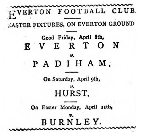 The latter team visited Anfield enclosure on Friday, 7,000 persons being present. The home team winning the toss, Padiham kicked-off, but Everton began to press and in about ten minutes George scored for them, while before the interval they scored another. During the second half of the game Whittle scored a third point for Everton from a pass by Fleming. Following this each teams scored a goal, riley doing the needful for the visitors. Everton thus won by four goals to one.