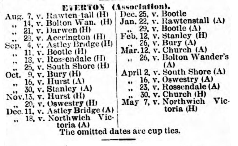The first match of the season was played on Saturday, in the presence of quite 1500 spectators. A start was not made until an hour after the time fixed. The game was evenly contested, and resulted in a win for the visitors by four goals to three. The home team was rather disorganised, and lacked cohesion. From a pass by Parry Briscoe scored first goal, Fleming supplementing this a little later on, but before half time Riley and Harper equalised matters, the score being two goals each. After crossing over Everton did some pressing, Farmer kicking a third. Nothing of importance transpired until shortly before time, when aided by a free kick Harper once more made the score level, and directly after from a corner kick, the winning point was notched. Teams; - Everton; - Joliffe, goal; Dobson (captain) and Brown, backs; Higgins, Corey, and F. Parry half-backs; Farmer, Shaw, Wilding, Briscoe, and Fleming, forwards. Rawtenstall; - Kay, goal; Barnes and Lord, backs; Harper, Taylor and Spencer, half-backs; Andrews, Pickup, Entwistle, Kirk, and Riley forwards.