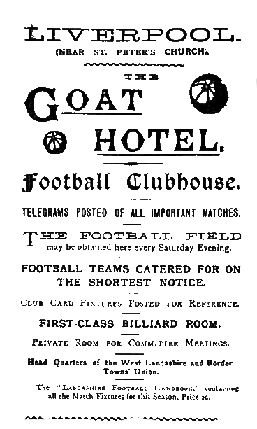 At Anfield on Saturday, before 2,500 spectators. During the first portion of play Everton had all the best of the game, scoring six goals to none. Afterwards the home team scored seven more goals, and the visitors one, leaving the result; - Everton thirteen goals; Linacre, one.