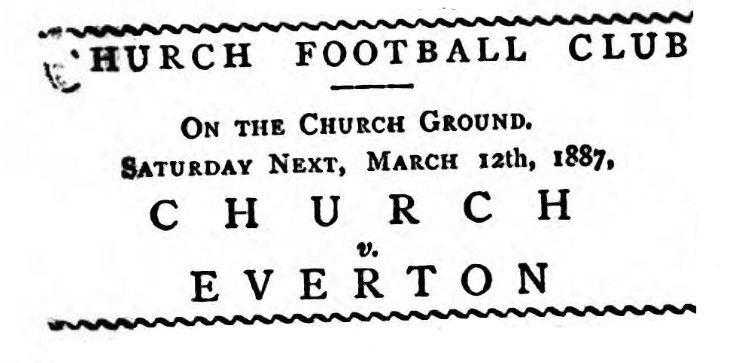 This match was played at Church. In consequence –of the late arrival of the visitors the game did not commence until a quarter to four o'clock. Church scored in the first minute Smith putting the ball through during a scrimmage. Immediately afterwards, as the result of a splendid run by Beresford, Holden added a second point; and through the home team were playing uphill and against the sun they maintained the advantage and Heresford was instrumental in adding another goal to the home team, the ball being put through by Gregson. Some even play followed and eventually Everton scored their first point. Gregson next made a grand effort, and Smith tackling the goalkeeper, another goal resulted, Heresford soon afterwards headed a fifth, and at the interval Church led by 5 goals to 1. In the second half the game continued for some time without ant change. An attack by the Everton forwards ended in a well-directed shot, which Thorp repelled. The visitors claimed that the ball had gone through, but the referee decided against them. Next Costley got a goal for Everton and a third being scored, Church finally won by 5 goals to 3.