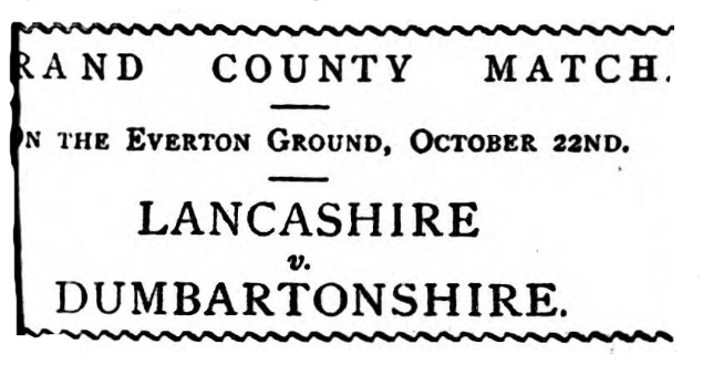 The strongest county in Scotland sent the best team they could select to do duty against Lancashire on the Everton ground. This is the first time an important county match has been played in the Liverpool district, though a couple of years ago, United Ulster was met at Bootle. Last season saw the first match between Lancashire and Dumbartonshire, and it was played on Oct. 16th at Renton. The game was a very hard fought one but, eventually, the home team was defeated by four goals to three. M’Aulay kept goal splendidly on that occasion, but the International is now far away. The match has aroused great interest in Liverpool, and the day was brilliantly fine there was a good attendance. The teams were Lancashire—H. Arthur (Blackburn Rovers), goal; B. Howarth and N. J. Ross (captain) (North End), backs ; Russell (North End), Weir(Halliwell) and Keenan (Burnley), half-backs; Lofthouse (Accrington), Davenport (Bolton Wanderers), J. Goodall (North End), Farmer (Everton), and Waugh (Burnley), forwards. Umpire, Mr. Sudell. Dumbartshire;- J. Wilson (Vale of Leven), goal; D. Stewart (Dumbarton) and J. Forbes (Vale of Leven), backs; R. Kelso, J. Kelly (Renton), and L. Kier, half-backs; Lella (Dumbarton Athletic) and D. McIntyre (Vale of Leven), right wing; J. M'Coll and J. McNee (Renton), left wing; R. Jamieson (Dumbarton), centre. Dumbarton was first the field, followed by Lancashire a few minutes later. Six thousand spectators were present. Jamieson kicked off, and Farmer shot in twice, and Forbes repelled. A free-kick to Lancashire was well cleared. The Dumbarton, left ran up and from a good centre Jamieson scored the first goal for Dumbarton two minutes from the start. Lancashire now spurted up Davenport just shooting outside. The game was now very warm, Lancashire having a slight pull. Weir just headed outside, and McNee next just over the bar. Farmer sent a beauty which Wilson cleared. The Dumbarton left made a fine run, and Jamieson shot over. A good run and shot by Farmer, Wilson handed out. -Dumbarton replied on the left. Goodall then struck the bar, and Farmer kicked over. Lancashire now gained their first corner, but nothing came of it. A fine shot by Farmer went just outside. Dumbarton replied, and, from a rush, scored second point. Wilson cleared from Lofthouse; Jamieson scored a third for Dumbarton, and halftime the result was Dumbarton 3, Lancashire nil.