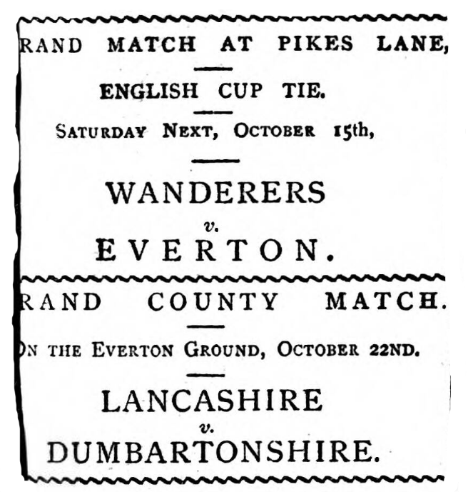 The meeting of Everton and St. John’s last Saturday was mutually unsatisfactory to the clubs engaged. The Everton Committee naturally under the necessity of having to give a date for the settlement of their tie to a club which could not possibly have the slightest chance of making a respectable show. The date for the completion of is October 8th, and as Everton have an fixture with Notts County for that date because necessary to play the tie last week, so far as they were concerned, for today is the Lancashire Cup day. The younger club has no enclosed ground, and as they are not allowed to play in the Parks