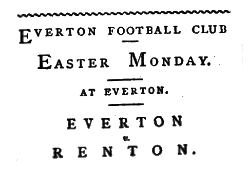To-day at Anfield Everton will try their prowess with better success, it is hoped, than of late, against the well-known Renton team, and if they are clever enough to come out of the formidable task with flying colours the bitterness of Friday and Saturday reverses will be toned down. On Wednesday Everton not content with the heavy work of late, cross over the border in order to tackle Hearts of Midlothians on the Scotchmen's native beath.
