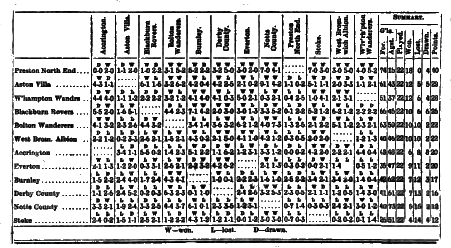 The return fixture should have been played at Blackburn but Witton preferred to again travel to Liverpool. About 6,000 spectators were present. Milward kicked off at 4-45, but senting too far forward, Isherwood had no difficulty in giving to his own forwards who ran the ball over the Everton touch line. Weir received the kick-off and gave to Keys, who raced away, and at the right movement gave to Chadwick and Angus but Smith intercepted, and by a hugh punt sent the ball to Smith jun, who shot outside the post. Milward then put in a nice run, with the assistance of Angus made good progess and Chadwick essayed a shot which Sharples threw away. Grimshaw pounced upon the ball, and then the Witton forwards showed excellent passing, and bothered Ross and Dobson considerably but Rushton relieved all anxiety by shooting over the bar. Again Milward and Briscoe tried to break through the capital defence of Smith Frankland and Sharples but these players for a while nonplussed the efforts of the Evertonians. Eventually Keys livened up and went off at lighting speed and got well down near the Witton goal, but finished up badly by a wide shot. Weir was directly afterwards cheered for a fine save in the mouth of goal, and for a time the Visitors had the best of the matters. A foul in midfield against Witton eased the pressure and a magnificent shot by Farmer, which struck the bar, was deservedly applauded. This wakened the lethargio homesters up a little and good combination being shown by Keys and Briscoe, Milward was enabled to get in a good position but the shot over. Keys made amends for this immediately by a clinking shot, which skimmed the bar. Rushton and Smith then got off and, passing Ross Rushton centred, but Smalley cleared grandly, falling on his knees to do so. Weir then beat Higgins and Horsefall,, and gave to Briscoe who in his own unique style, dodged first one and then another, and wound up with a good centre, which Angus headed in but Sharples punted out easily, and thus brought about half-time. Grimshaw restarted, and he, Higgins and Horsefield put in a very pretty passing run and compelled Dobson to kick out. The home team getting the best of the throw in enabled Farmer and Angus to get down and Milward missed an easy chance from their pass. Holt who had been doing excellent services now put in a beauty, which Sharples could only get away at the expense of a corner. Weir kicked in with excellent judgement and Briscoe headed against the bar, and another corner obtained. Frankland and old Mike cleared this and Horsefield kept Dobson fairly busy but Weir came to the rescue and robbed them. Keys secured the ball and got off in nice style, and centred in Sharples hands but again the custodian sent clear, and it seemed as though the match must end in a draw but just about this period Keys got severely kicked in the groin, and Ross seeing Everton having so much of the game, brought him full back, sent Milward on the right and went centre forward himself, and it was not long before the Witton lads knew of his presence, and it gave immense satisfaction to the large number of spectators when, by one of his characteristic sprints he literally ran the ball through, Sharples's goal and scored the only point of the match. Shortly afterwards time was called and the match ended as above . teams; Witton:- Sharples, goal, Smith, and Frankland, backs, Whiteside, Iserwood, and Pickering half-backs, Ruston Grimshaw, Higgins, Smith jun, and Horsefield forwards. Everton:- Smalley, goal, Dobson and Ross (captain), Weir Holt, and Farmer half-backs, Keys, Briscow, Milward, Chadwick, and Angus, forwards .