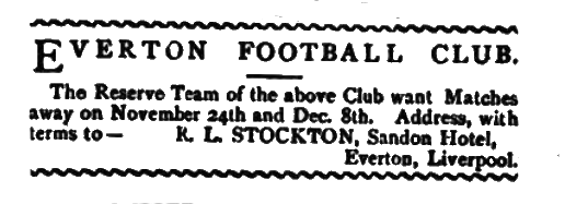 Everton Reserve want matches (away) Nov 24, and Dec 8, Terms to R.L. Stockton, Sandon Hotel, Everton, Liverpool.