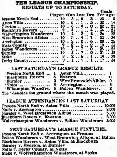 The commissioners deputed by the English Council to adjudicate in the matter of the allegations of misconduct against Dick (Everton), Hodgetts (Aston Villa), Russell (Preston North End), Sloan (Stoke) etc, have accomplished their task with completeness and expedition, if not with equity and leniency. The roving commission sat in Birmingham on Wednesday and in Nottingham on Thursday-an arrangement convenient for Aston Villa and Notts County, but notfor Everton, who thus had to devote time to two sittings in two different towns-and the upshot, of it all is that Dick is suspended for two Mouths and Hodgetts one month whilst Russell and Sloan escape penaltys. Football of course must be conducted in a respectable manner. The laws of play are readily understood and should be respected, and above all proper behaving ought to be observed but the punishment now inflicted is more harsh than the exigencies of the offences seen to warrant. Hodgetts is not known as a rough player and Dick Black as he has generally been painted is not vindictive in his tactics, though he no doubt often raises the ire of even heavier opponents by the effective use of muscular thighs in tackling; and even admitting that both men had committed a grave error under provocation, a strong reprimmand would have justly met the case. Birmingham people whilst ready to blame Dick are sensitive that great injustice has been doled out to Hodgett. If this be so, with what greater reason have Evertonians to complain of wrong for according to the commissioners finding Hodgett was declared to have actually delivered a blow whereas Dick could only be proved guilty of an attempt to strike ? However the fist of the commission has gone forth-the law in their eyes has been broken and vindicated, and the opportunity of lunging at the League perhaps gleefully embraced. Will the matter be allowed thus to rest? Violation of rules is not to be tolerated and fighting should be put down in a drastic manner, but the Association must be general and sweeping in their vigilance and remember that roughness is not an exclusive peculiarity of League matches any more than cup ties, but is liable to bubble up at all and sundry contests. It so happens that the players put through their facing at this latest inquiry all belonged to League clubs, whilst other clubs-out-side the twelve-equally involed in misconduct, have been overlooked, and if the Council wish to displace a suspicious of antagonism to the League, they will make haste to apply their power indiserinately without fear of favour. The commission having disposed of some cases of infringement of professional rules, wound up their labours by issuing a homily for distribution among clubs, and especially applicable to referees, on a rigid observances of laws and penalities and the desirability of commission endeavouring to maintain a reasonable demeanmour on the part of spetators. Birmingham Nottingham and other patrons will take note of this latter seasonable advice, it is to be hoped and then there will be small cause for confusions. The return league engagement between Burnley and Everton proved quite as tough a struggle as that of the drawn game at Turf Moor the previous week. Burnley entrusted the reputation of their club to the same hands that made an even fight at the first meeting, but Everton were a very dissimilar eleven. Dobson is still suffering from the accidental kick he received from McKay and, with Dick ineligible Sugg was transferred from centre half-back to fullback, Weir stepping into the middle line, whilst the Forwards embraced the long talked of new blood in the persons of Coyne (vale of leven), and Davie (Renton) room being created for these strangers from over the border by dropping out Brown and Watson. Everton had the advantage of a strong breeze in the first half, which was so well utilised that they had the substantial lead of 3 to 0 at the time the interval was announced. Burnley replied with a couple of effective shots on an exchange of ends, giving the Anfieldites, with a score of 3 to 2, their seventh victory in connection with the league. Smalley played another grand game in goal, saving at times when it seemed impossible almost to cope with such a fierce attack. Sugg although at times doing some especial work, was a weaker defender than Ross. Burnley having covered this flaw, disposed their forces accordingly, and with Sugg once overcome a cross over was resorted to which tactics gave Burnley their two goals. Farmer, Holt and Weir each did so well at half-backs that it would be unfair to make a selection for superiority. The two new forwards both made a favorable impression. Davie showed be possessed judgement at centre, and, what is more to the point, was not slow in parting with the ball it be though it could be done with better advantage; and altogether he bids fair to be a great acquisition when a sufficient trial has allowed him to become familiar with his wing men. Coyne partnered Fleming, and treated the spectators to the neat short passing of Scotch brand, remaining one of McNee in the Dunmbartonshire and Lancashire match, and he often came in for an approving cheer. Fleming was hardly powerful enough for his colleagues whilst Chadwick greatly overshadowed Costley, was perhaps the best of the home front line.