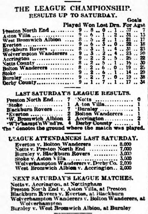 Saturday's enjoyment was disturbed by thorough going and most cheerless of November weather and dangerous and dullness were as Handy Andy would put it. ‘'Like bad luck-everywhere ‘' The ill-fortune, however, from an Evertonian appear only appites to the meteorological conditions for did they not average-not overwhelmingly, but effectuate-their previous reverse at the hands-or rather to be accurate, at the feet of their old notorious and yet respected opponents that Bolton Wanderers ? On a slippery ground, and in the presence of a large company, which would have been greatly increased under favorable skies the defeat of a month back was turned into victory, and the score reversed in the shape of 23 goals to 1. Instead of 2 goals to 6, Everton thus emerging from nine Leafage tussle with six wins and three losses. They have now settled their account with four clubs having played home and away with Aston Villa Notts County Derby County, and Bolton Wanderers, the remaining contest, the first of the series having given Everton a success over Accrington and the Anfieldites are now planted deeply in a forward position among ‘'the twelve.'' The game on Saturday was of a highly-strung order, the pace being sustained almost throughout, despite the heavy state of the turf from the rain that fell for many hours previously and continued till the interval. There was also a stiffest breeze sweeping from Anfield to Oakfield-road goal against which and the slope the home representative had to content at the outset and yet they fully held their own during the first half, ends changing with both goals intact. On resuming Everton immediately went down to goal in business-like fashion, and were not long ere they scored. This was followed by Ross shooting through, only to be denied, owing to his own Umpire's prior claim for foul, and shortly after the Wanderers pulled up level from a free kick in front of Smalley. Some tem minutes later Ross took full scope of a chance and, with a shot there was no disgrace in allowing to get home, scored the winning point. dick reappeared in the team, and shaped all the better for the leisure of the last three weeks, for he was always safe, in the first half especially so. Dobson also played a grand game, and it would be hard to say which was the more useful in their respective styles of defences. All the half-backs were efficient Holt excelling in accurate kicking, and Weir in tackling. The Forwards were remarkable for hard work rather than combination, but this will be accounted for by the uncertain footing on the saturated ground. W.Brown at length resumed football after his suspension and made a favorable impression on the outside left, his passes being generally well timed, but he was poorly, backed up by Chadwick Watson and McKinnon also were not at their best. Neither Mills Roberts nor Harrison had charge of Bolton's goal, but Gillan-an associate of Everton in their practice games-and he and Smalley were both clever and about equally safe. All the visitors backs were smart, which Davenport and Brogan were the most dangerous of the Wanderers front line.