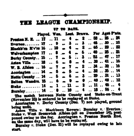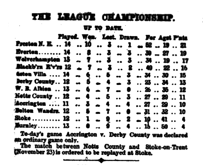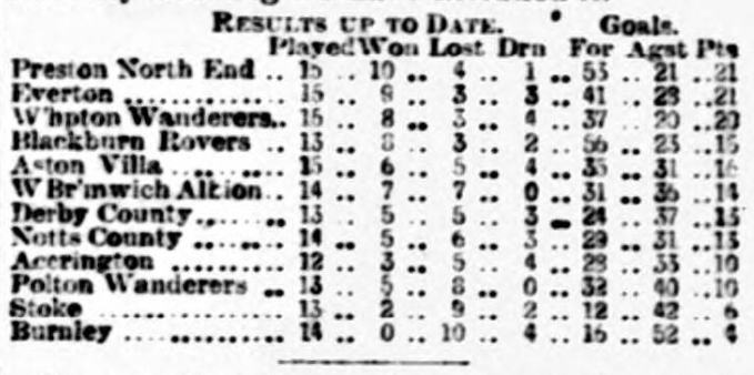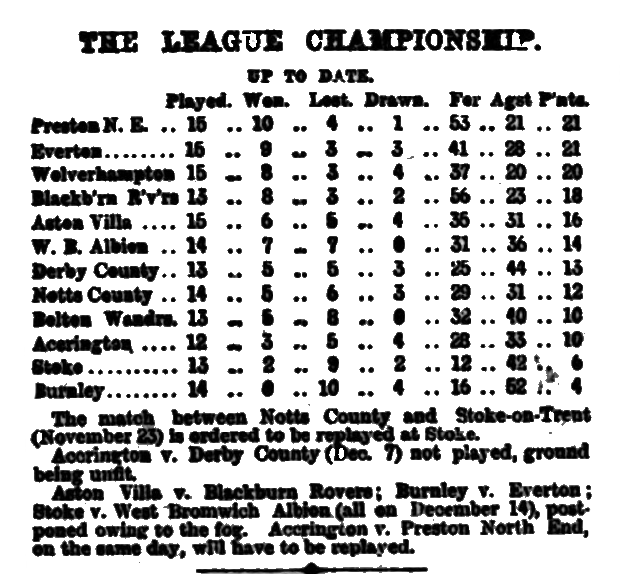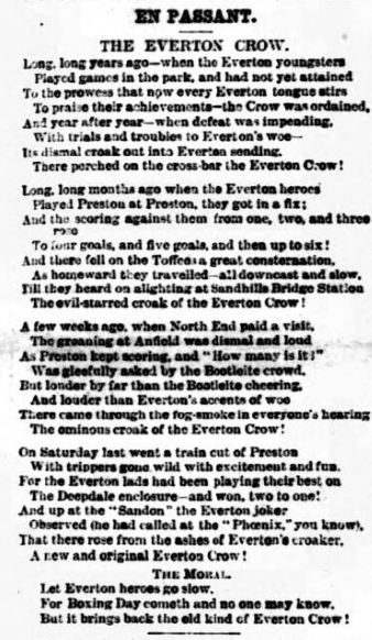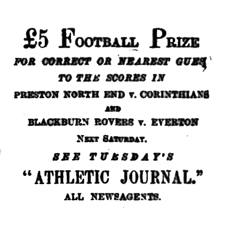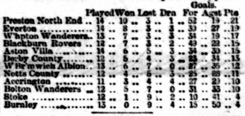 Everton, we congratulate you on having attained on Saturday your greatest triumph—the just ambition of every club—the ability to overthrow the rightly-styled champions, and Liverpool generally join in jubilation. Both Everton and Bootle have made many gallant attempts to assert the supremacy of Liverpool football over that of Preston, but it has hitherto been in vain, though the deed was nearly done when Bootie, in September, made a drawn battle with Preston North End. Now Liverpool’s time has come, and the “good old town” is justly proud of “good old Everton” for having, by their skill and pluck, placed it in the foreground of football. There must be especial pleasure to Everton in this last victory, for it was gained against the same team as had beaten them so unexpectedly easy on November 16, since which date Everton have carried everything before them, in many cases with ridiculous ease. Indeed, the defeat at Anfield has turned out another “blessing in disguise," and Everton have thence improved daily, gaining confidence and more perfect combination, until they have so “set their house in order” as sally out to Deepdale with no fear and trembling, and return victorious from a magnificent encounter by two goals to one, with a trio of disputed points to boot. Mr. Sudell entertained the winners to tea, and said on the day’s play the better team had won, and, sportsmanlike, assured them he did not begrudge them the honours they wrested.