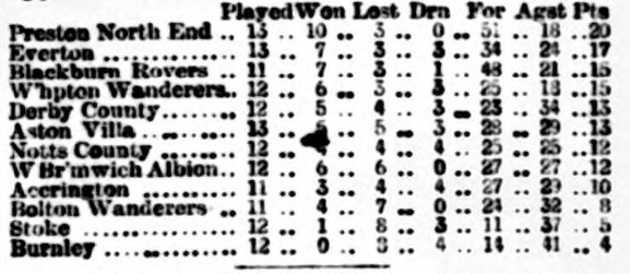 That the Everton star is now fairly in the ascendant, event in the South and more recently at home give the amplest proof. Evidently the lesson imparted by North End last had a salutary effect, for now the team is acquitting itself in a style far superior to any of its earlier effects, and as progress continues to be made, it will take a raking combination to measure its strength before the season is over. It will readily be recalled to mind that, following their disastrous defeat by Preston North End, the Everton defeated Aston Villa, at Birmingham by two to one, and travelling still further South, the London Calendonians and Casuals were beaten on successive days by six to one and seven to two respectively, results which furnish reasons for regret that the Southern clubs estimated the powers of the Liverpool men so lightly. In the light of such splendid victories the game with Witton was regarded in the spirit of a forgone conclusion, although, of course no one was prepared for the sensational scoring which ensued. There was only one change in the Everton ranks, and as Holt was indulged with a well earned rest, Weir who had been invalidated since the match at Wolverhampton, took his place in the team. On the other hand considerable changes had been made in the Witton combination, notably forward, and as the result shows, the Witton of today differs very materially from the Witton of a couple of years ago. Out played from the start, a quartette of goals were registered against them during the first half of the game, the excutants being Chadwick and Geary who scored a couple of points each. It was during the after-part of the game, however, that the onslaught was greatest, and surely no team were ever so mercilessly treated as the unfortunate Wittonians now were. The industrious goalkeeping of Sharples was of no avail, for with backs and forwards beaten, it was one man pitted against eleven, and as a consequence, goals were scored with amazing rapidity. Chadwick notched a couple more, these being followed by one from Cain. Witton were absolutely powerless to attack, and taking the fullest advantage of their opponents' weakness, the Evertonians rushed six more points, and finally won by the extraordinary number of 13 goals to nil. It is worthy of mention that five of the goals were scored by Geary, four by Chadwick, and one each by Latta, Brady, Cain and Milward. Early in the week the Evertonians paid their second visit top Denton and as their fame had evidently proceeded them, three thousand “Jolly batters” turned out to witness the play. Parry and Smalley were absence of the latter Walter Sugg made his debut in goal with credit to himself and to the advantage of his club. Having satiated themselves in the manner of goal-getting, the Evertonians were on this occasion satisfied to play what, under such circumstances, is usually regarded as an exhibition game, consequently a goal by Latta was all that was scored during the first period of play. Afterwards the Scotsman added a second, and Milward supplemented the effort. Everton won their fifth successive victory by three goals to nothing. Dentonians no doubt bring well pleasant by escape on such easy terms. In the first match of the season in Everton Reserves defeated Birkdale by nine goals to nil, but on the teams meeting in the return fixture the Reserves had to be content with a three goals to nil victory, but had it not been for the erractic shooting of Nidd the score might easily have notched double figures. Orr (2) and Kirkwood succeeded in notching the points for the Reserves.