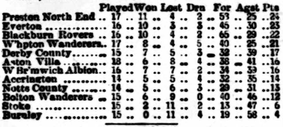 Preston North End have opened their Christmas fixtures disastrously, and for the first time have had to acknowledge themselves conquered by the Everton team. The reverse was a severe blow for Prestonians, as it will be remembered that a few weeks ago North End defeated Everton at Anfield Road by five goals to one. This achievement must have lulled North End into a sense of false security, for they were not only beaten on points, but, taking the match as a whole, they had the worst of the play. In fact, their most enthusiastic supporters acknowledge that they were beaten on their merits. Now Deepdalians are endeavouring to find out the reason for what they look upon as a somewhat serious blow to the prestige of their club, for in addition to Saturday's defeat the matches played on the two previous weeks had not terminated successfully for North End. There are no excuses made by the losers, and the only reason seems to be that Everton to a man played fast, clever football—football which their opponents could not, for once at any rate, equal them in. North End had the same team which won the great victory at Anfield-road in November, and the only alteration on the other side was at half-back, where Cain replaced Farmer. Although the ground was very slippery and heavy, both sides played a fast, determined game throughout, which speaks much for the stamina of each player. The game had not progressed very far when Everton managed to get the ball past Trainer: but, as Milward had obstructed the custodian, the point was rightly disallowed. However, Milward was not long before he converted a shot by Geary into a goal, and this was the only point recorded before the interval. Soon after crossing over Everton had a goal disallowed, but Geary registered a second. Then Drummond scored for the home team, and just afterwards put the ball through a second time: but this point was also forfeited. Strive as they would, North End could not place themselves on an equal footing, and they had to submit to a defeat of two goals to one. No one who saw the match will deny that every man in the Everton team deserves great praise; they were all in the very best of condition. The forwards showed some excellent quick passing, and Latta, Brady, and Geary were very prominent. Parry and Holt did some rare work at half-back; while the defence of Doyle, Hannah, and Smalley would be difficult to surpass anywhere. The best men on the North End side were Trainer, Howarth, Gordon, and Ross, jun. Not one of the others played up to their reputation. It was surprising to see the manner in which the forwards were dispossessed time after time. It is evident that there will have to be some new blood at Deepdale, and very soon.