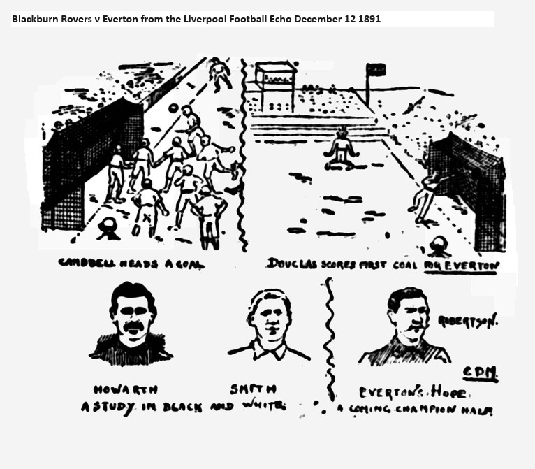 Everton did not maintain at Ewood Park on Saturday the strong line assumed at Everton when opposed to Aston Villa; but they did fairly will to make a draw with Blackburn Rovers, who, like all other clubs, are seen at their best when at home. Indeed, they have only been beaten once at Ewood this season, and that was on the occasion of the visit of Preston North End, whilst those who have fallen at Blackburn are Sunderland, Notts County, Bolton Wanderers and Wolverhampton Wanderers. Everton have only once enjoyed the distinction of defeating the Rovers on the latter's own ground, which happened two season's ago, whilst last year, though then obtaining the championship, they were defeated by 2 goals to 1. The Rovers on Saturday undoubtedly missed McKeown , as Douglas was only of moderate assistance; but Everton were without Kelso, and he would not doubt, as he did on September 19, at Anfield, have despoiled Townley's dashing running propensity. The conditions under which the sides took the field were thus about even, and the result was, despite a high wind which blew from goal to goal, that the spectators had the pleasure of witnessing a carefully fought game, brimful of good points. Everton had the wind at the commencement, and went away in such well-knit combination that the two goals early scored were quite merited, for, allowing that Douglas made Everton a present of the point, it should be remembered that Milward, direct from the kick-off, scored with a fine shot, but was adjudged by the referee to be off-side though many thought otherwise. The Rovers improved after threw two goals had been scored against them, and had the best of the later play, whilst the Everton forwards became more ragged in their tactics. The second half was marked by the best periods of the game, but visitors seeming to control the ball better against the breeze than with it. Still the Rovers' forwards, especially the wings, were the more dangerous, and but for the splendid defensive tactics of Everton must have scored. Williams kept goal marvellously, and at one time knocked out five hard shots within the space of about a minute. Howarth was a bit faulty in his kicking at times, but was safe at close quarters, and Earp had plenty to do, and did his work fearlessly and effectively. Holt was at his best and never allowed Southworth to shine, and the forwards worked hard and evenly. Forbes, was too wily for Latta and Wyllie, and the Rovers halves were always smart.