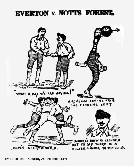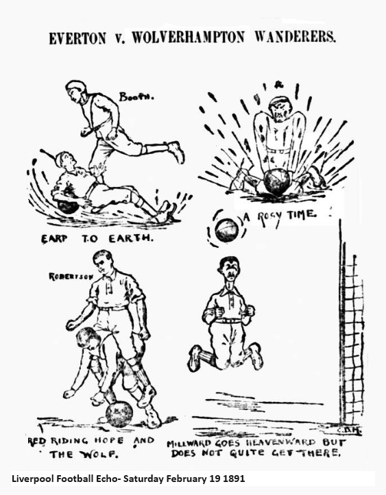 That the occasion was the meeting of Everton and Aston Villa; that the latter had been going “great guns,” having in their five preceding matches beaten in turn Stoke (away), Darwen (away), Notts (home), West Bromwich Albion (away), and Stoke (home); whilst Everton had cur a sorry figure at Preston, Darwen, and Wolverhampton, and had defeated West Bromwich Albion only on this post at home; that the chances thus favoured Aston Villa, and when the game started at Anfield-road hope, rather than assurance characterised the feelings of the Evertonians. That Everton had a few changes from the team that fell heavily at Wolverhampton, Robertson returning to left half-back, and Mclean superseding Kirkwood on Holt’s right, whilst Collins re-appeared and partnered Earp; that Aston Villa were without Cox, Baird taking his place and G. Campbell going half-back; that these changes were certainly an improvement as far as Everton were concerned, but hardly to the advantage of Aston Villa. That the game was expected to be a grueller, for Everton were determined to exercise all the pluck and skill they could command to shake off the ill-success which ahd stuck to them like an octopus so tantalisingly; that Aston Villa, on the other hand, had many an old account to settle with Everton, as they had never paid a visit in the League competition to Liverpool without suffering a substantial reverse; that the game opened full of promise of being fast and even, despite the miry state of the ground, but that Everton soon got into the proper if latterly unfamiliar line, and always seemed to hold the whip hand, winning, after pressing fully three parts of the time, by five goals to one. That maxwell gave an important display, as did Wyllie in tackling, and Chadwick and Milward in shooting, and that Latta thus found himself by way of a chance, in good company, the forward play being always compact and impressive; that the half-backs could hardly have bene improved even if Kelso had been in his place, and of the backs and goalkeeper they were seldom called upon. That Aston Villa were rarely in combination, and on Saturday’s form made one wonder how they could have won nine games out of a dozen, and have scored an aggregate of 39 goals; that Evans and Hinchley were the two most conspicuous men in the forlorn cause of the Brums.
