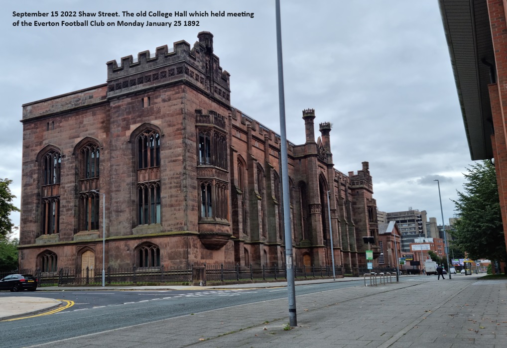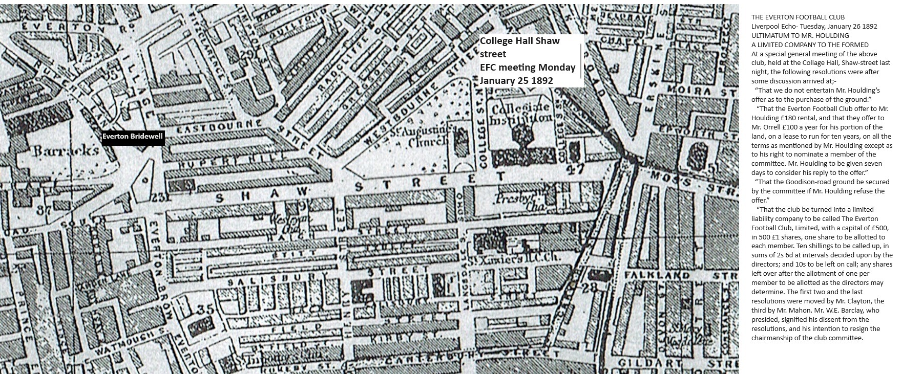 A special general meeting of the Everton Football Club was held on Monday night in the Colleage Hall, Shaw Street for the purpose of hearing the repute of the sub-committee as to new ground, rental, tenancy, &c, and to obtain the direction of the members thereon. The meeting was also convened to consider the desirability of forming the club into a Limited liability company, to purchase Mr. Houlding's and Mr. Orrrell's grounds on the basis of such a company on similar capital and to lease the present or any other ground. There was a good attendance of members and Mr. W.E. Barclay presided. The Secretary (Mr. R. Molyneux) read the minutes of the last general meeting. The members were provided with copies of the propose prospectus for a Limited liability company, as drawn up by Mr. Houlding, and the report of the sub-committee upon grounds at Goodison-road and Walton Breck-road. Particulars of both these documents have appeared in our columns.
