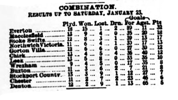 Everton; Williams, Earp, Howarth, Robertson, Holt (Captain), Kelso, Latta, Wyllie, Maxwell, Chadwick, and Milward. The referee was Mr. H. J. Hughes, of Northwich.