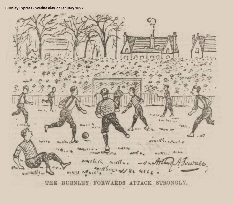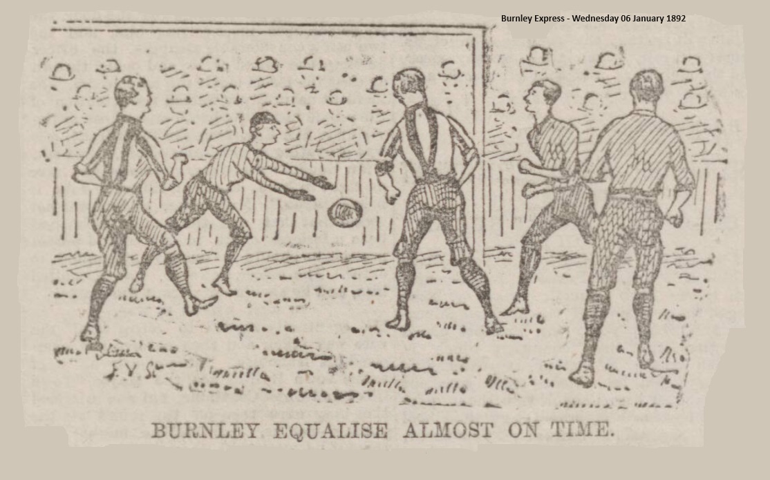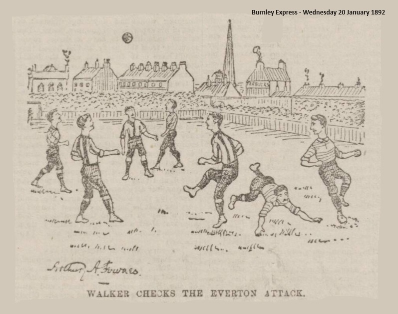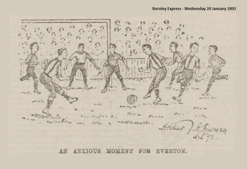 The circumstances that Burnley and Everton meet again in a fortnight at Liverpool to play off the National Cup tie caused an immense amount of interest to be taken in the League fixture at Anfield last Saturday. The vile weather which graced the auspicious occasion apparently had no effect on the attendance whatever, for the usual thousands of Evertonian followers filled up to the ground spite the wintry blast and blinding shower. The ground was in very fair condition when the rival teams entered the enclosure, and although it told on the soft side after the recent heavy rains there was nothing to militate against the play. The champions placed their best available team in the field, and after their somewhat unexpected success over Aston Villa last week great hopes were entertained of the result by the “Dickey Sams” generally. How these hopes were damped-I can scarcely say crushed, for no one sustained actually a defeat-I will endeavour to relate. Having been fortunate in the toss Burnley very naturally elected to play with the assistance of the wind for the first half, and although ti was far from blowing a gale yet now and again some distinctly acceptable gusts came down the field to bother the home players a good deal. Shortly after time Maxwell commenced work for Everton, and for some time the play was of a very open character. The Evertonians worked well down by the aid of their famous left wing time after time, but what with the adverse currents of air and badly directed shots no scoring ensued, although on several occasions goals appeared as though they could hardly be avoided. The game continued much in this strain throughout the first half, and although Everton kept up a well sustained pressure-chiefly through the efforts of Chadwick and Milward-the splendid back play of the visiting team proved too good for them. Burnley, aided by the wind, came briskly down the field, and Nichol and Bowes were well to the front on two or three occasion, but the Everton defence was prepared for the emergency, and notwithstanding that Williams had several spirited shots to keep away he succeeded in doing so much to the relief of the spectators generally. When the Burnley forwards made an effort it was usually a good one, sufficient to tax the Evertonian defence to its utmost limit, but half time arrived with no score for either side. At this stage of the game it was popularly considered a good thing for the Champions, for seeing they had successfully held their own against the breeze great things were naturally expected of them with it. The gentle zephyr, however, although assisting the home players to a considerable degree, was not equal to the task of scoring goals for them, and the game proceeded for some time an animated demonstration of spirited attack and stubborn defence. During one of their raids, however, the ice was eventually broken, Milward successfully opening the score for Everton from a rough and tumble scramble almost under the Burnley crossbar. This point naturally varied the monotony, and both teams played up harder than ever. Burnley especially putting tremendous vigour into the game. Fouls were frequent incidents to both sides, and for sometime all attempts at scientific football was assuredly at a liberal discount. Several of the players were temporarily hurt, and the whistle was being continually in order to give some individually player to get that necessary strength of breath into his body again. Towards the close of the game Burnley showed up well against the wind, and after running a strong sortie for some time equalised the score by a goal from their left wing almost on the point of time. Needless to remark the final point was not received with rapturous applause. In taking a retrospect of the game two points stand out clearly above the others. The first point may be attributed to the well executed movements by Chadwick and Milward as representing the Everton left wing, and the second may be described as the splendid defence shown by Walker and Lang as constituting the back division of the visiting team. The match throughout was exceedingly well contested, and from its result the cup tie should prove one of the most exciting in the round. Liverpudlians rely chiefly upon Geary, who turns out with his team for the first time since his accident, to carry the balance, and doubtless if this crack centre forward is in anything like his usual form he will prove a great acquisition, yet withal the issue is distinctly far removed from any certainty. May the better team win- and may that team be Burnley!