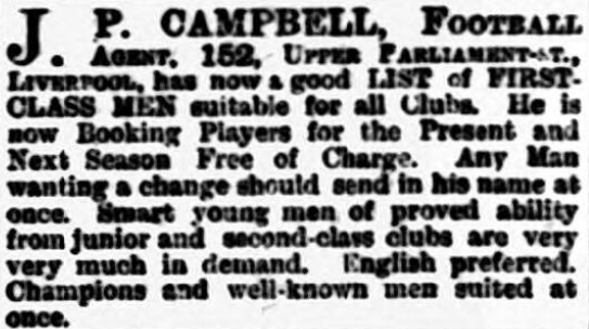 Considerable surprise was expressed by the members of the Everton Football Club upon proof being obtained that a company had actually been formed with the title of the “Everton Football club and Athletic Grounds Company, Limited.” Which was registered in Someset House, on Tuesday last, and to the articles of association, of which the signatures appended are Roberts Edward Berry, William Houlding, Alexander Nisbet, John James Ramsey, John Dermott, William Francis Evans, and John McKenna. The capital is to be £15,000 in £1 shares, and the company are to be continue using Mr. Houlding's ground for football, &c, as its name indicates. Looking at the who proceeding, it was remarked that while the general meeting of the club's was being held on Monday night, the papers for registering the new company were already in London, seeing that they were registered the next day. The effect of the formation of the company was the subject of general discussion amongst almost all classes of the community. Some contended that it would alone be entitled to be known as the Everton Football Club, while the vast majority contended that this was a point which ought to be strenuously disputed by the members and their committee who are busily engaged in carrying out the resolution of Monday night to seek for a ground elsewhere. Those who are fully acqualated with the rules of the Association and of the League urged that these two bodies would have to recognised the new company as the “club” before any play could take place under auspices with any other club connected with them, and there be some doubt that the committee will take immediate steps to represent the present conditions of matters officially to both the Association and the League authorities. It was found out that if the new company should succeed in being accepted into membership with the Association and the League, the dividends must under their rules be limited to 5per cent, that being the utmost allowed in order to preserve the purely sporting and athletic character of the football. Any profits made admitting a dividend above that amount are to go to a reserve fund or to be spent in the interest of the game. It is necessary to understand also that the Association is “a law into itself,” and so is the League; and there can be no such thing as compelling either the one or the other to recognised any club or organisation of which it does not approve. Of course it is impossible to predict the course which may be taken by the two great authorities named but it is quite certain that the Everton Football Club, through its circumstances, will leave nothing undone to maintain its own and will dear to the new company any right to lay claim to a portion of the title which they have assumed.