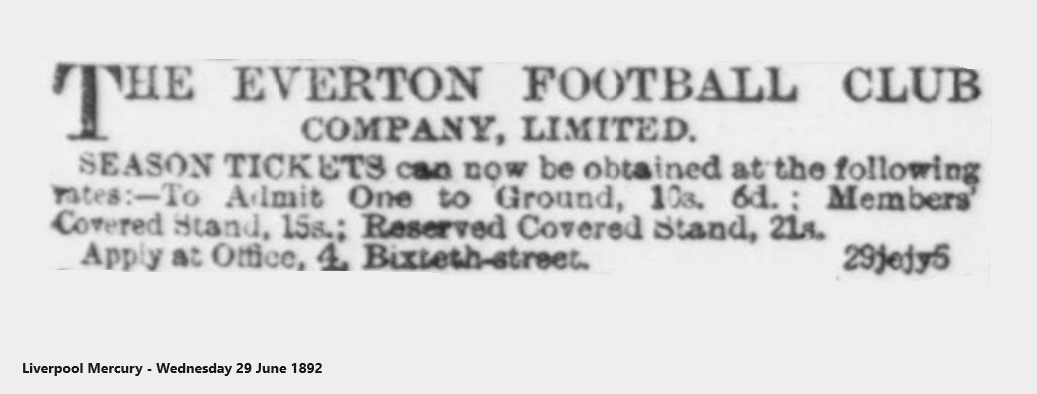 I may say that the Goodison-rd site is well advanced, and stands etc. capable of holding 30,000 people, will be up by the end of July. The stand accommodation at Goodison-rd will not be so extensive as supposed, as the committee are relying upon the quite as good methods of banking up with cinders. The covered stand will hold 3,000 and will be erected on a similar description to the Blackburn Rovers stand at Ewood. Seven thousand will be able to see the game from behind each goal, and 10,000 on the Goodison-rd side of the ground. The prices will be on the popular side, the nimble sixpence gaining admission to three sides of the ground.