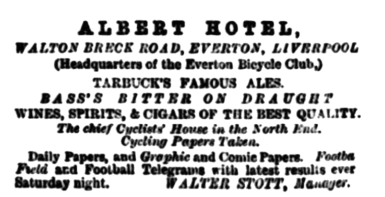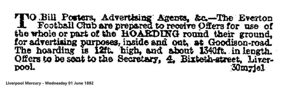 I may say that the Goodison-rd site is well advanced, and stands &c., capable of holding 30,000 people will be up by the end of July. The Stand accommodation at Goodison-rd will not be so extensive as supposed, as the committee are relying upon the quite as good methods of banking up with cinders. The covered stand will hold 3,000 and will be erected on a similar description to the Blackburn Rovers’ stand at Ewood. Seven thousand will be able to see the game from behind each goal, and 10,000 on the Goodison-road side of the ground. The prices will be on the popular side, the nimble sixpenny gaining admission on three sides of the ground.