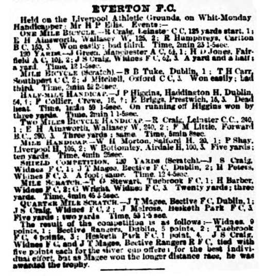 A success, as pronounced as it was thoroughly deserved, was the outcome of the labours of the Everton F.C executive on the occasion of their first annual athletic sports, decided at the Liverpool Athletic grounds on Whit-Monday. Glorious weather favoured the meeting, and though a good attendance was confidently anticipated the “gate” exceeded the most favourable estimate. For a long time the turnstiles were literally besieged, and the check-takers had little rest until something like ten thousand spectators lined the enclosure. Indeed, so great was the crush, that the barrier at one time gave way, and the spectators encroached on the track, but matters were speedily put to rights, and little delay was occasioned. A programme of more than ordinary interest was issued, whilst the entry was not only fairly numerous, but of much better class than is usually associated with any one Bank holiday fixture. A strong contingent of Irishmen came over from Dublin to compete, whilst the presence of Sonny Morton in the distance events created much additional interest.