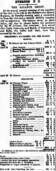 The balance-sheet to be submitted to the members of the Everton Football Club on Tuesday next shows a balance of £875 2s, 1d, in hand. The balance carried forward from last year was £1792. During the expired season the gate receipts amounted to £5747, and receipts from matches played away £502. The expenditure amounted to £7749, of which sum £4038 went in payment of players' wages. Advertising cost £83, travelling expenses amounted to £843, clothing and materials to £127, insurance of players £67, and legal expenses £9. Appended to the balance sheet is the following;- In addition to the above the following amounts are still due to the club; Doyle £69; amount due from other clubs, £27 10s; amount due from Lancashire Association, £63 10s 8d; amount due from Mr. John Hounding, £310; proportion of wages advanced to players £200. Due to Mr. John Houlding for rent, £125.