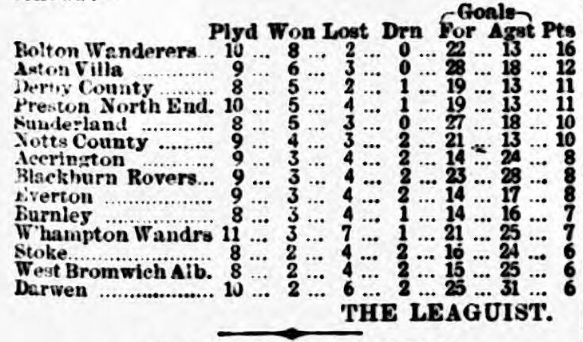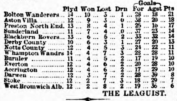 Interest locally in the Association game centres at Anfield-road this afternoon, where Everton, who have been away during the two previous weeks, with disastrous results, at Darwen and Wolverhampton, will join issue with Aston Villa –the most improved club in the League. In 1890 Aston Villa finished in the last four with 19 points, and did seen worse last year, scoring then 18; but now, though only having played twelve matches, they are practically “top sawyers” with 18 points. This is a great advance, and it is evident that Everton have a formidable task before them if they have generally achieved hitherto at Anfield-defeat Aston Villa unequivocally, Everton will again have an altered team from that of last week, as Williams has been nominated for goal, and Kelso and Robertson, if well enough, will return to their positions as wing half-backs. Otherwise the team is the same as that which played at Wolverhampton. Earp will make his first appearance in the League jersey at home; whilst the forwards, who are at times were clever last Saturday, should improve on acquaintance.