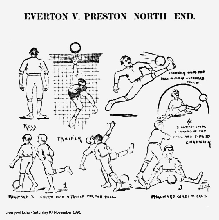 One of the great games of the season was that at Deepdale. The teams could not have had a better day for their important contest, and the North End showed the vast gathering that they can play football as well as anybody on a dry turf. Everton have not the well-worn excuse of saying that they were not were not suited by the ground, as they often have when at Preston, for it was in the best condition. The real reason is that the Liverpool men met a superior team, who not only passed beautifully and shot accurately, but tackled fearlessly and defended grandly. In fact their football was of the very best quality.