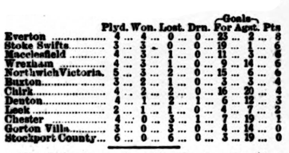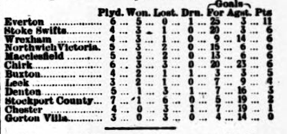 Stoke swifts the first combination fixture of the teams took place at anfield before 5,000 spectators, the vistors were the first to show up prominently and the home goal had a narrow escape from a shot by fraser, who just shaved the post, from the goalkick the home team rushed up and forced a corner but this was easily cleared, and forester receiving the pass, ran nicely down and centred to tunncliffe who defeated smalley with a spendid shot. Both teams now played up vigorously, and each goal in turn seen the scene of attack. Smalley being troubled the most, everton tried hard to draw level,, but without avail and at half-time the score was stoke swifts 1 gooal everton nil. In the second half parry equilsed the score from a penalty kick , and shortly afterwards everton scored again the homme club findly winning a capital match by 2 goals to nil.