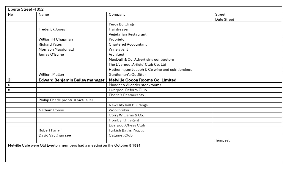 The old members of the Everton Football Club, to the number of about sixty, met last night at the Bee Hotel, St. John’s-lane; Mr. T. Evans, being in the chair, supported by Mr. W.E. Barclay and Mr. John Houlding. A capital dinner, provided by the worthy host, Mr. Tom Bush, having been disposed of in satisfactory fashion. Mr. Houlding said he was very pleased with the reception he had met with. In 1885, before he purchased the football field, the Sandon Hotel was doing quite as good a business as now. He did not think anyone could accuse him of having made money out of outdoor sports. Mr. Orrell had the land left to him, whereas he (Mr. Houlding) had to buy his position. He had never asked more than 4 per cent, for money which had to be taken out of a business where he was making 7 or 8 per cent. The efforts of the members present had caused the club to reach the very highest position. The new members forget that the old ones had built up the club. He had always tried to walk straight, and he thanked those present very sincerely for their kind reception. Mr. W.E. Barclay said Mr. Houlding, acting in conjunction with the old members, had made the club what it was. If Mr. Clayton and Mr. Mahon, whom he classed among the malcontents, would produce a definite scheme, they would be ready to consider it. It would be disastrous if they had to leave the present ground. Mr. Houlding was not a Shylock, and he hoped the members would stick to him. This was not a political question.