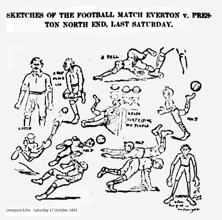 The fog was very dense when Everton left Liverpool, but on reaching Preston the sun was shining brilliantly, and so far as the elements were concerned, everything promised well for a good game. With the exception of Maxwell (inside right) and Jardine the visiting team was the same as last week, whilst North End turned out as follows;-Trainer, goal; Holmes and Ross, backs; Sharpe, Ross, and Stewart, half-backs; Gordon, Ross, jun., Drummond, Towie, and Gallacher, forwards. Between 2,000 and 3,000 enthusiasts journeyed from Liverpool by special train, and at the time announced for the start there would be quite 12,000 onlookers present. Both teams were cheered on stepping into the enclosure, and at five minutes past three Latta started for the visitors. Towie and Drummond were first away, but found McLean too much for them. Kirkwood was next noticeable for stopping an homeward movement of the home left, and then Milward shot in ineffectually. J. Ross, and Gordon then went off up the right, the former forcing a corner, which was well cleared by Kelso. Everton rushed up the right, but could not penetrate the defence of the North-enders. The home towards, by the aid of Ross and Drummond, forced another abortive corner, and Latta removed the venue to near the centre. Sharpe sent in a long shot, which Jardine had no difficulty in disposing of, and then the visitors got well into their opponents’ territory, and Chadwick was very near the desired mark. For the next few minutes the Everton defence was sorely tried, but at length Kelso relieved. Chadwick and Milward indulged in some smart passing. Sharpe, however, intercepted, and sent to half way. Again the visitors returned to the attack, and after several exchanges near the goal, Wyllie shot without effect. So far the game had been of a pleasant and exciting character, both teams putting in their utmost, and the ball travelling quickly up and down the field Milward sent across to the other wing to Wyllie, who centred well to Latta but the visiting centre failed to reach the ball. The home left rushed off to the other end, and twice sent wide. Trainor was next called upon to use his foot, which he did to advantage, but the visitors still keeping up the pressure, Nick Ross was compelled to concede a corner. This having been safely got rid of, Gallacher and Towie initiated a grand onward movement into their antagonists’ quarters, Kelso effectually repulsing, and Kirkwood swayed as attempts to lower the North End colours, but without success. The game continued very fast and each goal in turn was assailed, but the defence of both was impregnable. Drummond was instrumental in a raid being made on the Everton stronghold, and free kick gave the homesters some advantage, but Kelso averted the danger. Nice passing amongst the Preston front division was now witnessed, and Gallacher shot over. North End, however, again assumed an aggressive attitude and the home right pair succeeded including McLean and Gordon centred to Drummond, who had no difficulty in defeating Jardine. After thirty five minutes’ play this success was naturally greeted with tremendous cheering. Everton then conceded a free kick for a foul. The ball was well placed by McLean, and Maxwell receiving sent to his partner Wyllie just skimming the bar, and a moment later the same wing took part in a similar movement. A brief visit was next paid to Jardine, and then Maxwell and Wyllie had a run, and just as the latter was about to shoot the whistle sounded for an informality. The game was of an even character up to the interval, just before which Kirkwood was particularly conspicuous and Maxwell had an ineffectual shot.