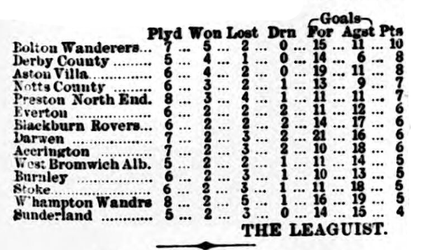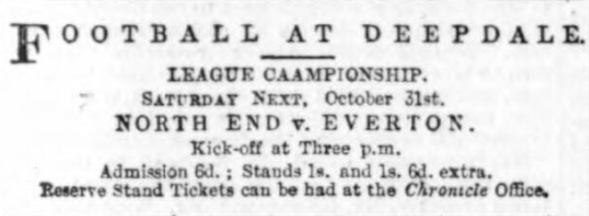 With Asscoicationists, the most absorting event is that of the renewed struggle for supremacy between Everton and Preston North End in connection with the League. These contests with the champions and ex-champions have always been Everton's most vital games of the season; but the present event has a special degree of interest associated with it, from the fact that the principals have met once before this season, and made a draw, and again, on account of each team scoring a clear success last week when North End visited and defeated Blackburn Rovers, and Everton did even better in journeying to the midlands and overthrowing Derby County, who up to that moment were actual leaders of the League. Everton, well and reasonably satisfied with their performance at Derby, have chosen the identical team for this afternoon, with the exception that Jardine displaces Williams in goal. Deepdale is easy of approach, and as the charges are light, it is certain that Evertonians will be present in force.