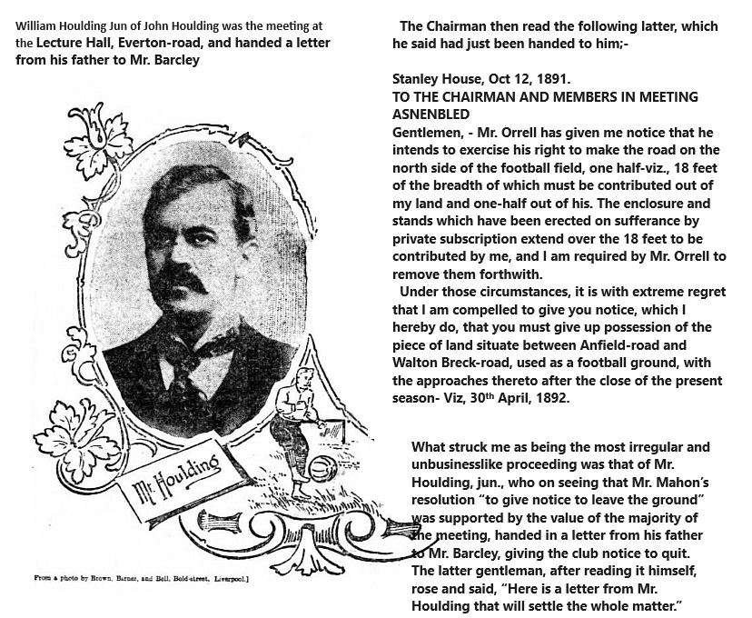 The Chairman said that a letter had appeared in the Echo with respect to Mr. Houlding’s first candidature for Everton. A Mr. Hall had stated that Mr. Houlding had promised £25 to the club if the members would support him in his candidature for Everton Ward. This the speaker flatly contradicted, as also did Mr. T. Marriott.