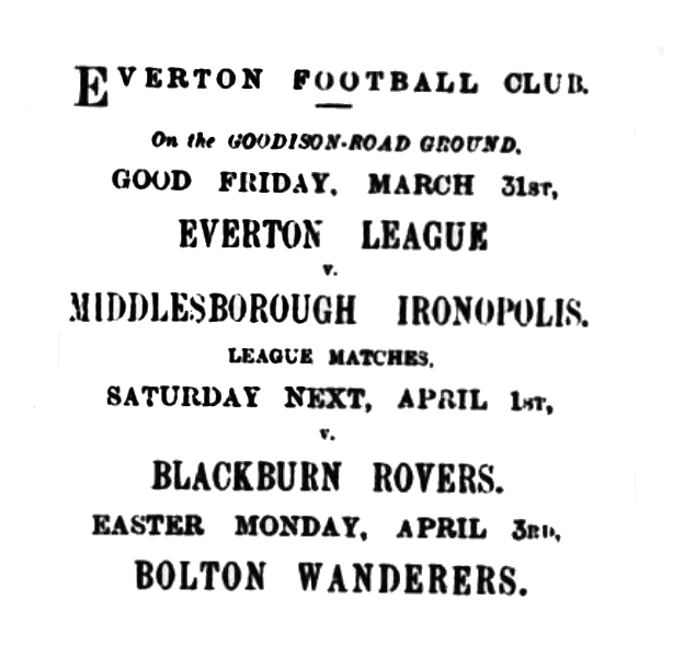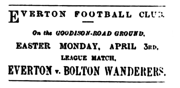 The three leading clubs have fixtures for today. Everton have their old popular friends the Bolton Wanderers as visitors, the occasion being the return League match. There are several incidents that make this contest attractive. In the first place, the “Trotters” won by 4 goals to 1 when Everton were at Bolton, and so there is the incentive of sweet revenge” to spur on Everton, and the corresponding impulse on the part of the Wanderers to confirm the previous result. Then the Wanderers and the Blackburn Rovers, as it happened, tried their fortune on successive days with Sunderland, and, whereas the Rovers had to be content with a draw on Friday, the Boltonians were clever enough on Saturday to beat the famous Wearsiders by two goals to one. Though this line of play it would seem that Everton have a more formidable task set them today than on Saturday; but they will have all their “stars” available, and will, moreover, it is expected, be assisted by Bell of Dumbarton, who played centre-forward for Scotland against England last year. He is a man of weight and height, we understand, and will be of great value in rushes upon goal. For the occasion the Everton directors have made arrangements to reserve a number of seats on the covered stand at an extra charge of a shilling.