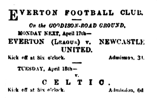A committee meeting was held on Tuesday evening when there were numerous applications to play benefit matches, the Everton club receiving permission to play one for that deserving player A. Latta (and I hope it will be a good one), and another for the National Lifeboat Fund. Aintree Church v. Everton, which will be played on the Bootle ground on April 11th.