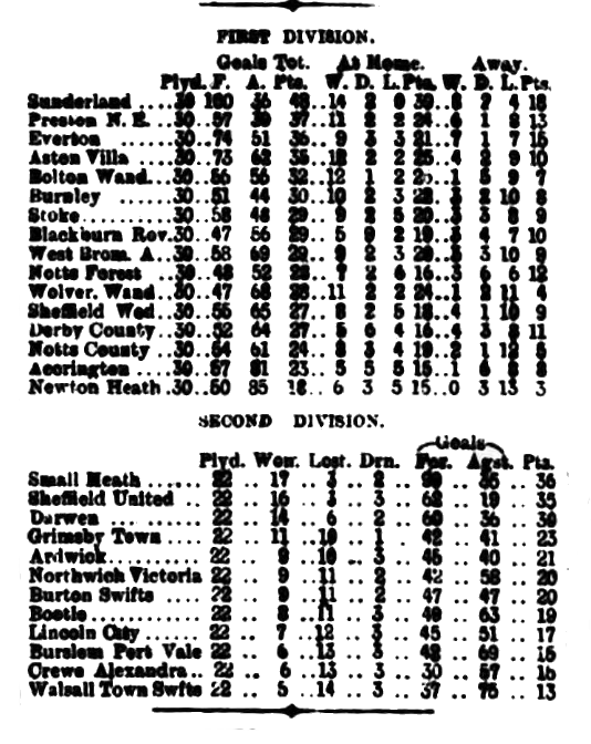 Bolton Wanderers played their last League engagement of the season at Goodison Park, where they were opposed to Everton. The weather was quite summer-like, and the crowd of 20,000 persons assembled. Everton played a new man in Bell, late of Dumbarton. The Wanderers were fully represented, with the exception that Gardiner was substituted for Monro. Weir started the game which opened in a sensational manner, and the home forwards showed some fine combination. Latta scored after five minutes for Everton. Both teams then showed fine form, but the mode of attack adopted by the home men was far in excess of that shown by Bolton. After repeated unsuccessful attempts by Everton to increase their score, Latta at length go a second past Sutcliffe, and at the interval Everton was leading by two goals to nil. Early in the second half the homesters assumed the aggressive, and persistently attacked Bolton's citadel, Latta and Chadwick being very near, but Sutcliffe splendidly cleared his charge. Everton attacked very strongly, and Geary and Holt were both loudly cheered for fine movements. After fully 15 minutes pressure by Everton, Toone gave relief, and Dickenson got off on the visiting left, sending in to Williams, who fisted away cleverly, repeating the performance a moment later from Wilson. Chadwick was injured and retired 20 minutes from the finish, but re-appeared soon afterwards with his knee bandaged. Sutcliffe again saved brilliantly, and Bell shot over. Another lengthened attack by Everton followed and then a fruitless corner fell to the Wanderers. Everton once more got in front of Sutcliffe, and Geary at last scored. Before the finish both goals were endangered. Result-Everton 3, Bolton 0.