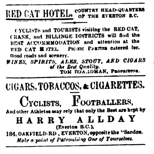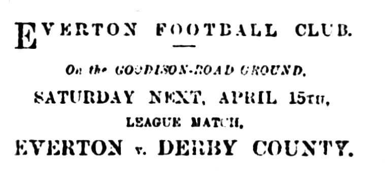 This friendly fixture was played at Goodison Patk last evening before a moderate attendance. Pinnell kicked off for Everton, who forced the matter at the start. Pinnel kicking a couple of goals. Aintree then pressed for some time, but their shooting was weak, for some time, and they were kept from scoring, Hughes and Killip put in some backplay,, but Elliott got a third for Everton. Aintree had a point disallowed for off-side and at half-time were in a minprity of 3 goals to nil. Upon resuming, Everton attcked strongly, Grattan saved finely, from Smith but only to be defeated by the same playa few minutes later. The churchites play up well after this, and after being repulsed by Parry, returned and scored. Everton only playing ten men through the retirement of Elliott. The home side, however, scored again, and won by 5 goals to 1.