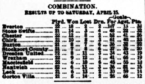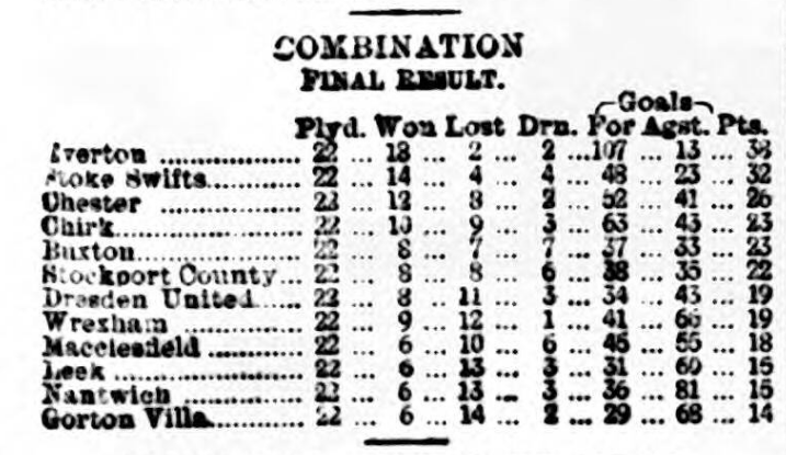 At Liverpool yesterday, before 15,000 spectators. At the opening play was even, Everton having a trifle the best of matters. After 15 minutes play Everton rushed off, and after good work by Geary, Latta scored. Everton generally had the best of the play, but Ironoplis broke away and Hughes scored. After change of ends Elliott shot a second goal for Everton, the game ending in a draw -2 goals each. MACCLESFIELD 0 EVERTON COMBINATION 0
