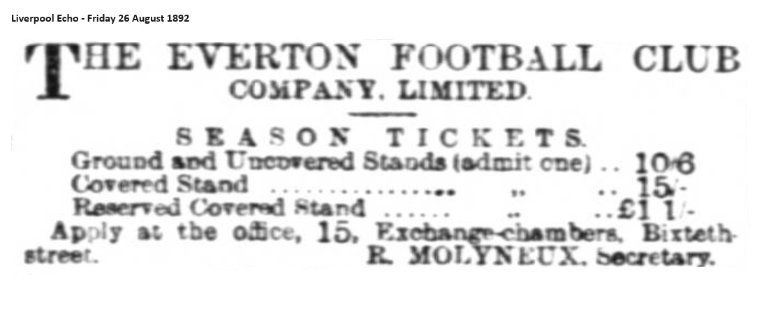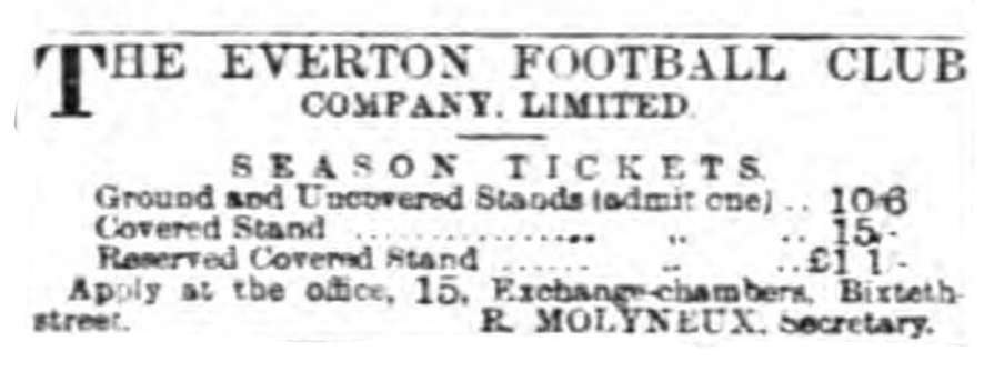 A meeting of the shareholders of the Everton Football Club company Limited.. was held last evening in the schoolroom of ther presbyerrian Church Royal-street. Mr. G.Mahon occupied the chair, and there was a good attendance. Mr. R Molyeux (secretary) read the notice convening the meeting, with nexplained that it was called for the purpose of electing directors and to elect a momence to act on behalf of shareholders entitled to a free share. The Chairman gave an account of the progress of the company. He said they had now arrived at that stage in the history of the club when they were determined that no secret should be held from the general body of the shareholders. There were now 431 shareholders, and this was considered very satisfactory when they remembered that the total membership of the club was 490. These shareholders held 1,730 shares, and he would like to explain that it was though advisable not to give out the shares in blocks, by which means theu would have had the whole of the capital subscribed, but rather to have a number of applications, so that there would be more supporters of the club. The number of old members belonging to the company was 304, and there was 40 old members who had taken season tickets. Of the 431 shareholders there were 338 holding season tickets, and as applications were coming in daily he expected there would be another hundred. Showing the confidence that the public had in the club, he might point out that there was 40 more season tickets holders up to the present time in excess of the total number applied for on the old ground. (Applause.) they had a profit on the first athletic festival of £150, and he expected there would be a profit of about £100 on the second. The total expenditure amounted to £2,700, being £700 in excess of the estimate, but he thought that as they had obtained double the accommodation which was provided on the old fround there was no cause to grumble. (Hear Hear.)
