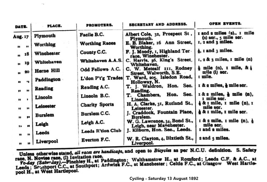 The first event was a two miles bicycle race, which was run in two heats. In the first heat T.H. Grace was first, T. Downes jun., second, and W. Leatherbarrow third; in the second, A.E. Barlow was first, F. Parry second, and E.S Edwards third; and in the final W. Leatherbarrow (Warrington) took the first prize, Mr. T. Downes jun., (Liverpool) the second, and E.S. Edwards (Liverpool) the third. The result of the 120 yards handicap were as follows; First heat, 1 D.M. Little; second heat, 1 W. Harbour; third heat, I H. Usher; fourth heat, 1 A. Winrow; fifth heat, 1 T. Sudlow; final, 1 A. Winrow (Ormskirk), 2 T. Sudlow (Wigan), 3. H. Usher (Old swan). In the 15 miles race, W.H. Morton (Salford H.) took the first place; F.E. bacon (Ashton H.) the second; and C. South (Ashton H.) the third. The winners of the five miles bicycle race were E.,S Edwards (Liverpool), first; J.H. Cruthers (Oxford), second; and W. Leatherbarrow (Warrington) third. The prizes which were exceedingly handsome and valuable, were distributed at the close of the meeting by Mr. George Mahon.