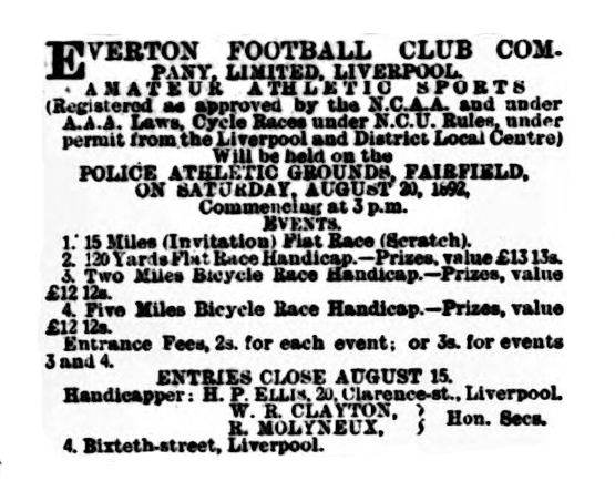 The amateur athletic sports in connection with the Everton Football Club Company, Limited, were held on Saturday afternoon on the Police Athletic Grounds, Sheil-road, Fairfield. The day was beautifully fine, and consequently there was a large attendance, which must have been a source of gratification to the promotors of the festival. Selections of music were played during the afternoon by the band of the 1st Volunteer Battalion King’s Liverpool Regiment, Mr. James Farrell, bandmaster. The officials were -Handicapper, timekeeper, and referee, Mr. H.P. Ellis; judges, Inspector Churchill, Mr. F.T. Parry, and Mr. R.E. Lythgoe; starter, Mr. E.A Bainbridge; marksmen, Messrs, Griffiths, A. Yates, Linacre, and W.H. Ravenscroft; call stewards, Messrs. W. Green, W. Wilson, and A.E. Leyland; stewards, Messrs. H. Smethurst (chief), McClintock, Atkinson, J. Anderson, H. Gardner, J. Hogg, A.E. Talbot, J. Morton, Ashcroft, A. Irvine, J. Worthy, G. Ashbury, W. Short, J. Swann, P. Nelson, John Davies, and John Lewis; hon. treasurers, Mr. W. Jackson, Mr. F. Currier, and Mr. J. Davies; hon. secretaries. Mr. W.R. Clayton and Mr. R. Molyneux.