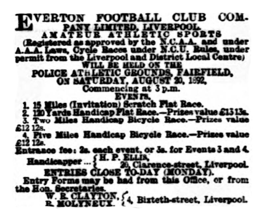 The amateur athletic sports in connection with the Everton Football Club Company, Limited, were held on Saturday afternoon on the Police Athletic Grounds, Sheil-road, Fairfield. The day was beautifully fine, and consequently there was a large attendance, which must have been a source of gratification to the promotors of the festival. Selections of music were played during the afternoon by the band of the 1st Volunteer Battalion King’s Liverpool Regiment, Mr. James Farrell, bandmaster. The officials were -Handicapper, timekeeper, and referee, Mr. H.P Ellis; judges. Inspector Churchill, Mr. F.T. Parry, and Mr. R.E. Lythgoe; starter, Mr. E.A Bainbridge; marksmen, Messrs Griffiths, A. Yates, Linacre, and W,H. Ravencroft; call stewards, Messrs, W. Green, W. Wilson, and A.E Leyland; stewards, Messrs H. Smethurst (chief), McClintock, Atkinson, J. Anderson, H. Gardiner, J. Hogg, A.E. Talbot, J. Morton, Ashcroft, A. Irvine, J. Worthy, G. Ashbury, W. Short, J. Swann, P. Nelson, John Davies, and John Lewis; hon. treasurers, Mr. W. Jackson, Mr. F. Currier, and Mr. J. Davies; hon secretaries, Mr. W.R Clayton and Mr. R. Molyneux. The first event was a two miles bicycle race, which was run in two heats. In the first heat T.H. Grace was first, T. Downes Jun second, and W. Leatherbarrow third; in the second, A.E. Barlow was first, F. parry second, and E.S. Edwards third; and in the final W. Leatherbarrow (Warrington) took the first prize, Mr. T. Downes Jun, (Liverpool) the second, and E.S Edwards (Liverpool) the third. The results of the 120 yards handicap were as follows;- First heat, 1 D.M. Little; second heat, 1 W Harbour; third heat, 1 H. Usher; fourth heat, 12 A Winrow; fifth heat, 1 T. Sudlow; final, 1 A. Winrow (Ormskirk), 2 T. Sudlow (Wigan), 3 H. Usher (Old Swan). In the 15 miles race, W,H., Morton (Salford H) took the first place; F.E bacon (Ashton H.) the second; and C. Souch (Ashton H.), the third. The winners of the five miles bicycle race were E.S. Edwards (Liverpool), first; J.H. Cruthers (Oxford), second; and W. Leatherbarrow (Warrington), third. The prizes which were exceedingly handsome and valuable, were distributed at the close of the meeting by Mr. George Magon.