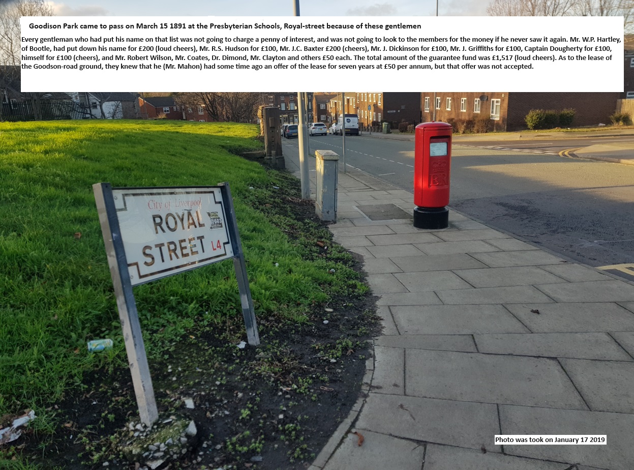 Everton have been visited by a real live lord, and that Lord the president of the Football Association. Yes, Lord Kinnaird has been to Everton, and has congratulated the Executive on the management, and also on their new ground. Of course, this was chiefly done in an after-dinner speech, but Lord Kinnaird is not the man to trot out flattery as the result of a good dinner, and to my mind, Mr. Mahon, and his committee deserve every credit for the manner in which they set to work to provide a new home for the Everton Football Club. It would serve no useful purpose to go through the reasons why a new ground was necessary, but it was, and on Good Friday Everton commenced the gigantic task of converting a mud heap into a passable football ground. I am assured that the piece of land at Goodison-road, which has been secured at a rental of 50 pounds a year on a seven years’ lease was a veritable wilderness six months ago, and the levelling up process has taken an average depth of 4 and half feet of cinders in order to make it level. This being done, the next question was the turf, and that had to be good, for it would have but a few short weeks to get knit together, as it were, before being required for active service, for the first match on the ground is fixed for Thursday next, I understand the sod was brought from Aintree, but that matters little; it is now in exceptionally good order, and with the excellent drainage which the cinders give, it ought to wear well. There were, however, other matters to attend to in addition to the playing portion, and first of all the wilderness was enclosed with hoarding something like 12 or 15 feet in height, and then the stands were erected. Quoting from the official description, the actual size of the field of play is 384 feet by 255 feet, and the makes something like 2 and 1 third acres; but the total area of the ground taken is five and a half acres, and this is enough land for any respectable club to have at an annual rental of 50 pounds. The executive naturally expect a few spectators, so they have provided accommodation for 40,000 to be going on with. It is easy enough to write 40,000 and I must confess that I was under the impression that in their zeal my Everton friends has been exaggerating somewhat, but a visit on Wednesday convinced me that they had not, and in my opinion, with sufficient banking –and the Everton people speak of a thousand load of cinders as if it were a truck load-it is quite possible to put 50,000 inside the immense hoardings. Now as to the stands. The covered one opposite Goodison-road is according to the official description a “well-built and imposing one of its kind.” At any rate, it is a very comfortable one, although a person of aldermanic proportions might find some difficulty in walking between the seats. The entrances are at the back and you therefore go down to your seat. Nice, warm cushions there are for the reserved people, and this portion is in the centre of the ground, for the stand runs the whole length of the touchline. Behind each goal are open stands 270ft each in length and these will hold 10,000, provided the spectators do not get too excited and will be content to stand still during the process of the game-which they won’t. I forgot to say that the covered stand has 13 tiers, and the only objection is that on the top seat the unfortunate occupants will have some difficulty in flowing the play on a dark, dismal day; and it is this spot which the Press have selected to enable them to give a true and faithful account to please the poor scribes, and are willing to provide each with an office, and two or three papers have already taken advantage of the offer and have erected telephones. Going down the staircase, we find a cinder track, on which the players may do a sprint, and then we are introduced to the dressing rooms-two and a bathroom for each team-fitted up with lockers. The baths are not the ordinary iron painted affairs, but are built of substantial timber, and about half a dozen can use them at the same time. The next room is nicely fitted up for the referee, and this is not only an original idea, but a real good one, for the much-abused official can now retire from field and dress in solitude, without being compelled to overhear uncomplimentary remarks about some of his decisions. The door is fitted with a substantial lock, and, if necessary, the directors are prepared to have it coated with sheet iron. At any rate, they have done all they could to make the referee comfortable. They have not put down a running track, being of opinion that the nearer you can get your spectators to the play the more your spectators will appreciate it; but, all the same, a good track on a popular ground would have done well. I might mention that the publicans in the neighborhood are fully alive to the necessities of trade, and are making most extensive alterations for the sale of liquor, and are spending a small fortune in paint of various hues. I must confess to an ignorance of the geographical position of the ground, but from what I was told there are stations to the right of it, stations to the left of it, and, in fact, all round it. Then the tram takes you to within a hundred yards of the entrance, and I should imagine it is nearer the city than the one in Anfield-road. Mr. Prescott is the discoverer and architect and he has been assisted in his work by Messrs Kelly Brothers, of Walton, while the gentlemen who claims to have made the turf of bowling-green excellence is Mr. Barton. But, without an energetic committee like Mr. Marlow, Mr. Clayton, Mr. Griffiths, Dr. Baxter, Mr. Molyneux, and others, no number of architects, builders, and turf manipulators could have made Goodison-road into one of the best football grounds in the country in the short space of five months.