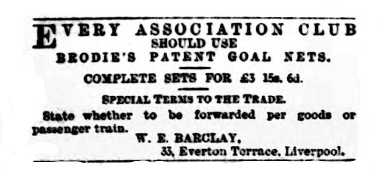 After the interval, play for a time proceeded quietly, but after the players had warmed to their work, Chadwick and Milward made some pretty runs, and these were supplemented by very fine work on the right wing and centre. The homesters were quickly in front of the Notts goal, but the ball on two occasions went easily over the goal line. Then the visitors tried to turn the tables on their opponents, but the half-backs worked with such energy and were so well backed up by Dewar and Howarth that the visitors found it impossible to get through their opponents lines. Then Latta distinguished himself by a grand shot at the Notts fortress, but unfortunately, the ball went a trifle high. More passing by the Everton men followed, and a nice chance of scoring was missed by Latta, who appeared to have the goal at his mercy, but allowed the leather to gently roll over the goal line. After this the homesters were very busy in front of their opponents' stronghold but all their efforts to score were unattended with success. After Geary had a shie at Brown's charge, the referee had occasion to caution one of the Forest players. The bombardment of the Foresters' goal still continued, but without tangible result to the homesters. Final Result; Everton 2 goals, Notts Forest 2.