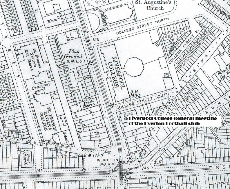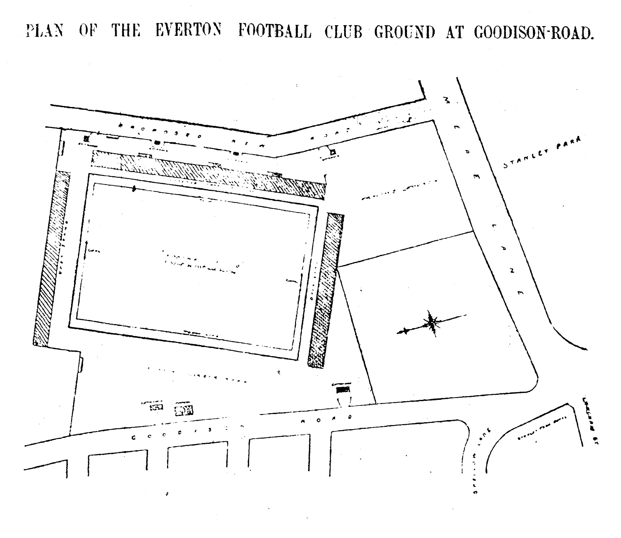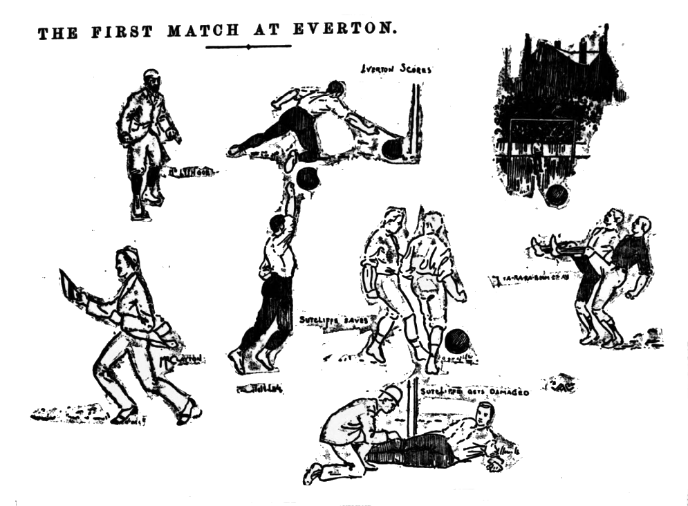 Everton played their inaugural match at Goodison Park on Thursday evening, their opponents being the Bolton Wanderers. There were 10,000 spectators-a good attendance for an evening friendly match. Everton appropriately commenced their new era with a victory of four goals to two, but it was uphill work. The Wanderers, before Everton had got into a good stride, scored the two first goals of the match.