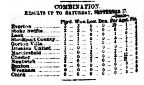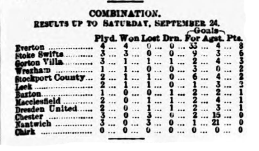 The subjected of conversation almost universally in the Liverpool district is the phenomenal success of the Everton Combination team, and the ease with which they secured goals must be a cause of envy to their confreres of the first team. In seven matches they have scored 57 goals to one, the only point scored against them being made by Chester, but who were yet beaten by 10 goals to one. They have played Nantwich twice in connection with the Combination, and taken out of them 19 to nil. Their latest victims were Liverpool Caledonians, whom they vanquished on Monday by four goals to nil.