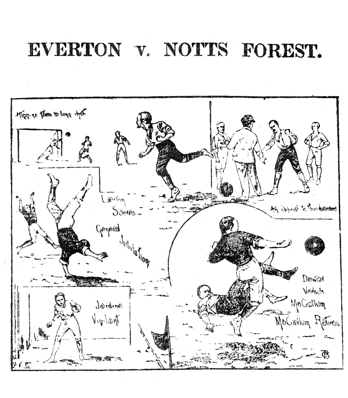 On re-starting Notts Forest went to the front, and Higgins, receiving a pass from Tich Smith, shot in hard. Jardine cleared with his hands, and Everton went very strongly on the right, where Scott proved a barrier. Everton were not to be beaten off, and forced a couple of corners. Dewar next passed up. Result Everton 2 Notts Forest 2.