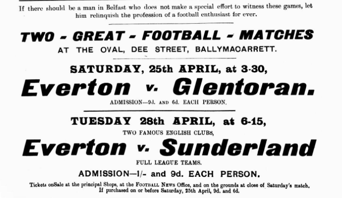 The first of a trio of matches arranged between Everton Sunderland, and some local teams was played at the oval at Belfast between Everton and Glentoran on Saturday. The ground was in good condition, but sloppy. Towards the close of the game there were over 2,000 spectator's present. Everton won the toss, and played with the wind towards the pavilion goal. Murray scored the first goal for Everton. A free kick almost immediately afterwards left the visitors two goals to nil at half time. The game started again without leaving the field and a fine exhibition of play was witnessed of which, Everton's combination was the chief feature. The final result was a win for Everton by two goals to nil.