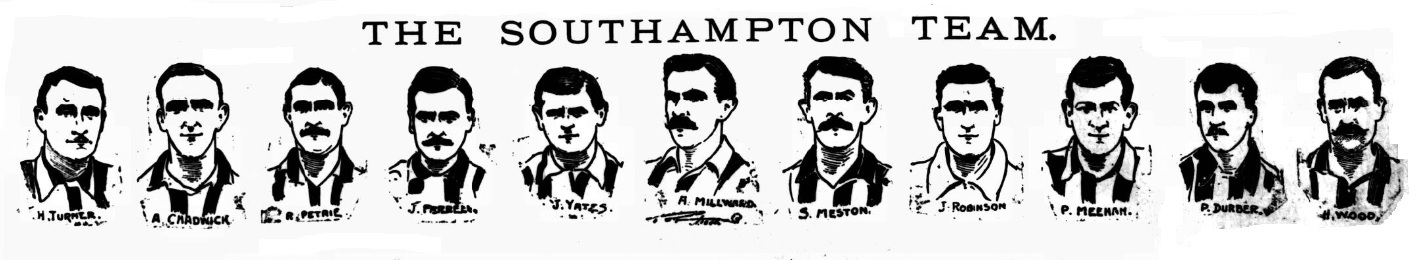 Everton; Muir, goal; Balmer, and Eccles, backs; Abbott, Blythe, and Wolstenholme, half-backs; Gray, Settle, Proudfoot, Taylor, and Sharp, forwards. Southampton.- Robinson, goal; Meehan, and Durber, backs; Meston, Petrie, and Chadwick, half-backs; Turner, Yates, Farrell, Wood, and Milward, forwards. Referee; A. Green, West Bromwich. Linesmen; C. Squires and H.C. Platt, London.