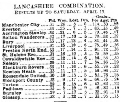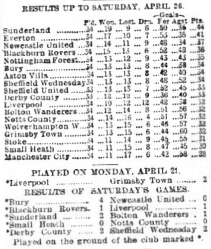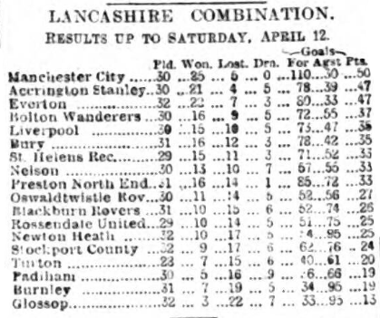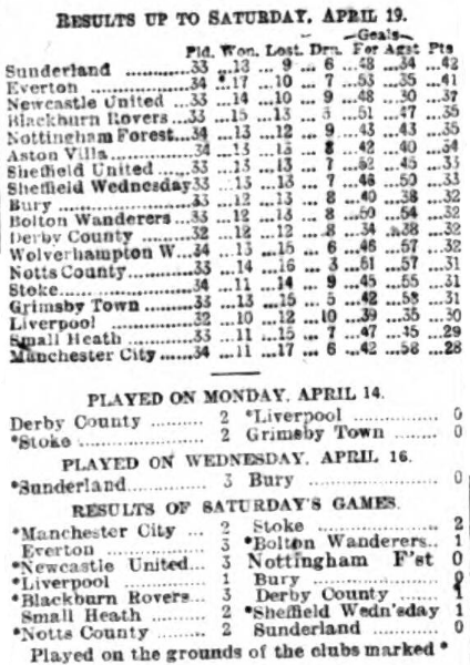 Locally the League tourney has latterly evoked any amount of speculation in two widely divergent directions. In the one case, Everton, part from two or three serious failures at home, still hold a very respectable place amongst the leading clubs of the country. On their recent holiday form the Goodison Park contingent may certainly be classed as one of the most accomplished and determined sides in the kingdom, and their display against Notts Forest on Monday was in its way a model exhibition of clever and classy football. Indeed, in the light of their present form it is somewhat galling to think that they must now play second fiddle to Sunderland. The Wearsiders early in the season took great care to secure all available points, with the result that they can now afford to view even a succession of drawn games with comparative composure. Had the Everton eleven only settled down to work in proper fashion three months ago there is little doubt that the League championship, if not the Association Cup, would have found a resting-place on the banks of the Mersey.
