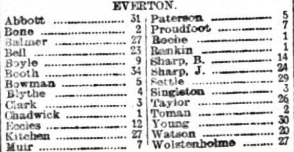 Everton; Kitchen; Balmer and J, Gillespie; Clark, Russell, and Williamson; Bowman, McMenemy, Proudfoot, Lang, and Sheridan.